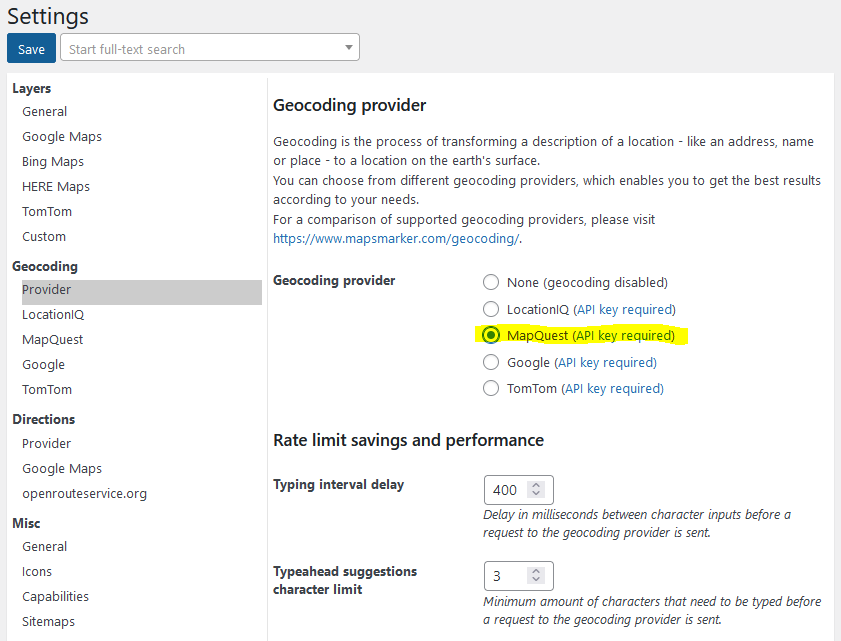Please note that MapQuest basemaps should also be used if MapQuest geocoding is selected! (Click here for a tutorial on how to activate MapQuest basemaps – FYI: you can use the same API key as for MapQuest geocoding).