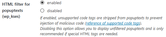 By default, popuptexts are now filtered using wp_kses() which is also used for default WordPress content like posts and pages.